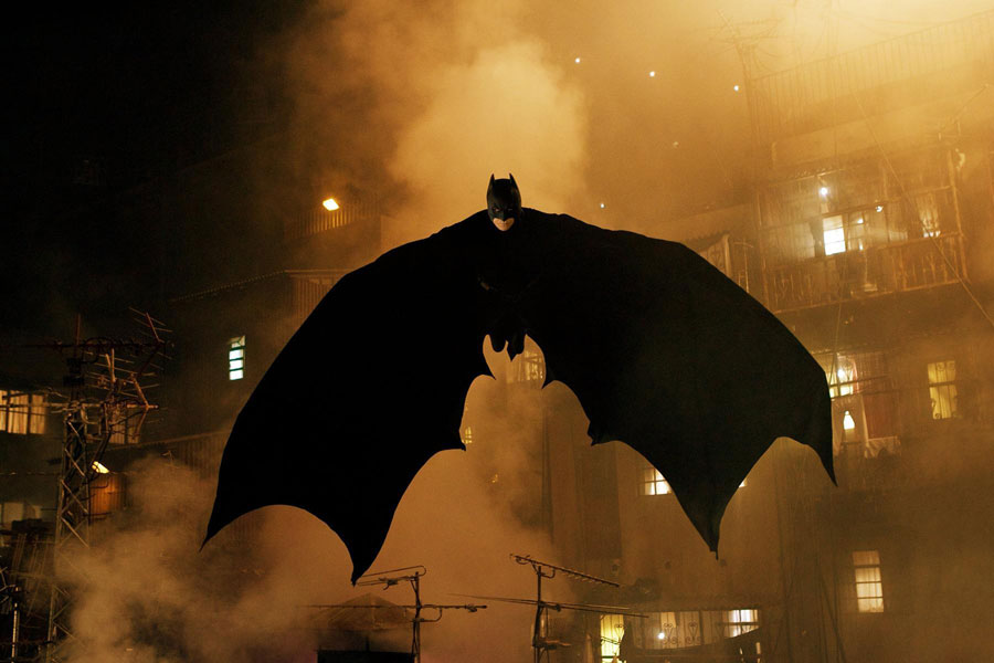 Even Batman flying… You might think that’s a bit over the top, but we based his flying on him using his wings like a hang glider. He was just coming down and going down to ground as if he was on a hang glider. That rig was sort of an overlap with the costume department. Certainly on Batman Begins we got involved in a lot of the flying around on wires, and he had this cape which was limp one minute and… high pressure air bladders and at the flick of a switch it would all go stiff and form the flying mode. It was a combination. Obviously the costume department were heavily involved in the design of the Bat-suit and the cape, and then we sort of overlapped the mechanics of how the cape worked. There were soft capes and hard capes and capes that inflated quickly… all sorts of different versions.