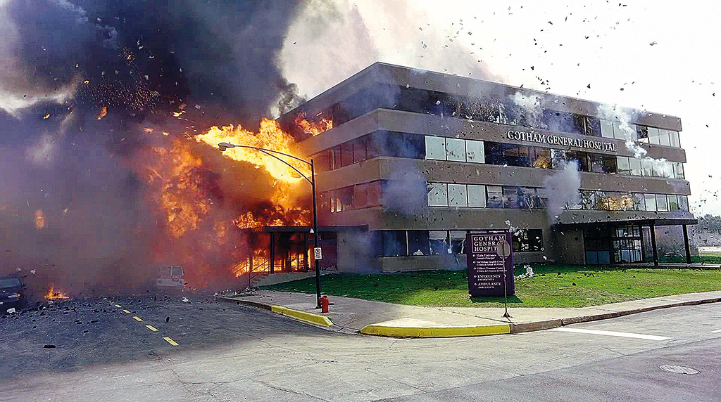 The hospital explosion was the same. That was a bizarre little story. Early on in the film Chris was tweaking the script, and I said to him, ‘You know, I’d really like to blow a building up on this’. He was like, ‘Hmm, okay, interesting…’ Next thing I knew, there in the script was the hospital blowing up. So we went through the whole process and got a demolition company on to work with us – they would do the demolition and we would put all the cosmetic pyrotechnics in. Come to the day before we did the shot, Chris Nolan came up to me and asked me something about the last time we did this. And I said, ‘I’ve never done this before!’ He said, ‘I thought you said…’ And I said, ‘Yes, I said I wanted to do it – I didn’t say I’d done it before!’ We had a good chuckle about that, and it turned out to be a fabulous shot. He had something like a dozen cameras on it, but I think he only used one, with a little bit of aerial. In the end it was such an all-in-one shot – he was very pleased with it.