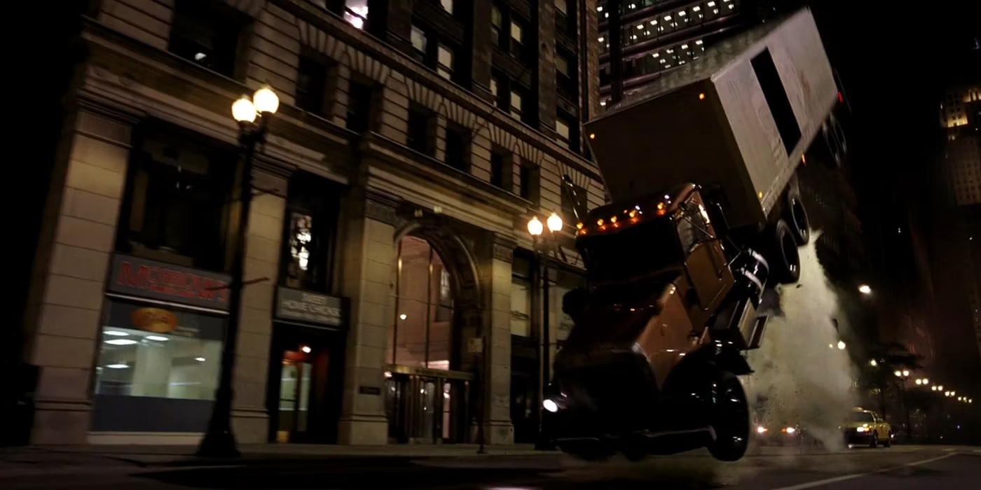 That was just the start of the story though. I went to Chris and told him he’d won, and that it looked phenomenal, and asked where we were going to shoot it. Then I saw this horrible little grin come in his face, and he told me he wanted to shoot it down LaSalle Avenue in Chicago. That’s the banking district of Chicago, and the width of the road isn’t much more than the length of the trailer! I thought, ‘Oh my god…’ We went down and recce’d the road, and I kept spotting all these manhole covers. I asked the utilities company guy what they all were, and he said some were local utilities, some were bank vaults… I had a survey done of what was underneath the road there, and there was only two spots in like a mile stretch of this road, where we could actually do the shot, because we had a piston coming down into the ground that was going to be generating a hundred tonnes – obviously if that lands on top of a manhole cover or a bank vault, the piston would have gone straight through the vault and the truck would have not gone anywhere! Eventually we found a spot, but I was like, this is a big deal – if I hit the button and the truck doesn’t go absolutely straight down the middle of the road, then we’re straight through the front of a bank [laughs].