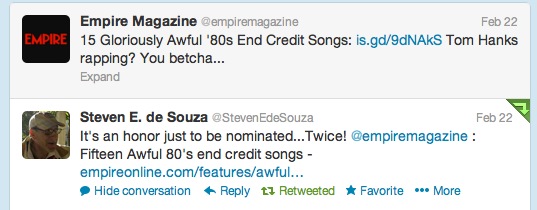 For no particular reason, a feature on terrible ’80s end-credits songs. I went for ‘terrible’ to avoid endless debates about ‘classic’. On the whole, people seemed not to take issue with these choices, which include Dokken, Frank Stallone, The Power Station, and Dan Aykroyd rapping with Tom Hanks. The horror.