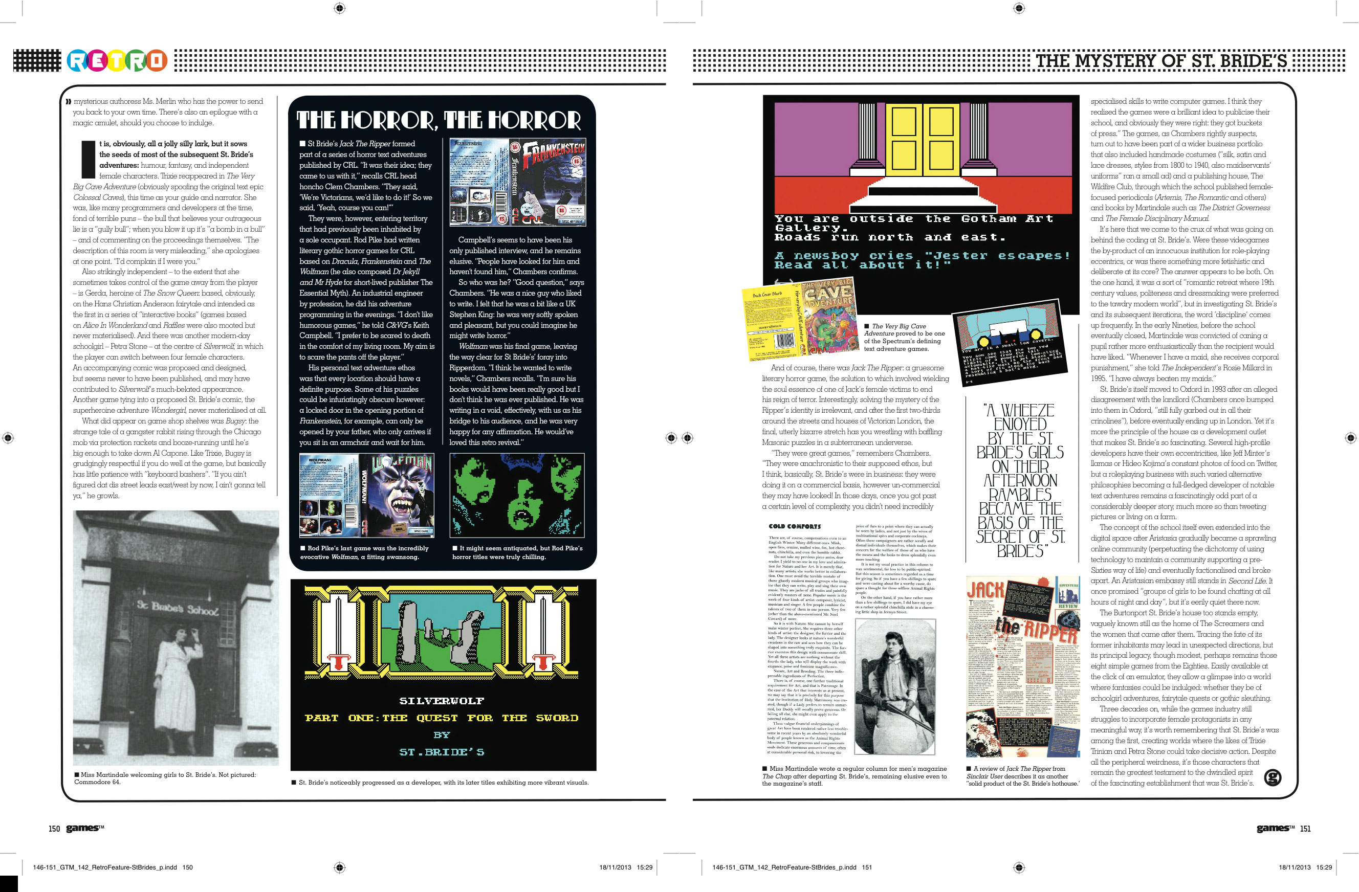 The feature is an investigation into St Bride’s School, a fetishistic institution offering Victorian schoolgirl-style holidays for women in the early 1980s, which somehow had a sideline in publishing text adventure computer games. Researching this was real down-the-rabbit-hole stuff: the more I found out, the stranger it got. There was a bit of back-and-forth in the edit between my interest in what happened to the women operating the school after it closed, and the magazine’s (not unreasonable) desire to stay as focused on the games as possible. What follows is my own preferred draft. Scans of the feature as it first appeared in GamesTM are at the end of the page.
