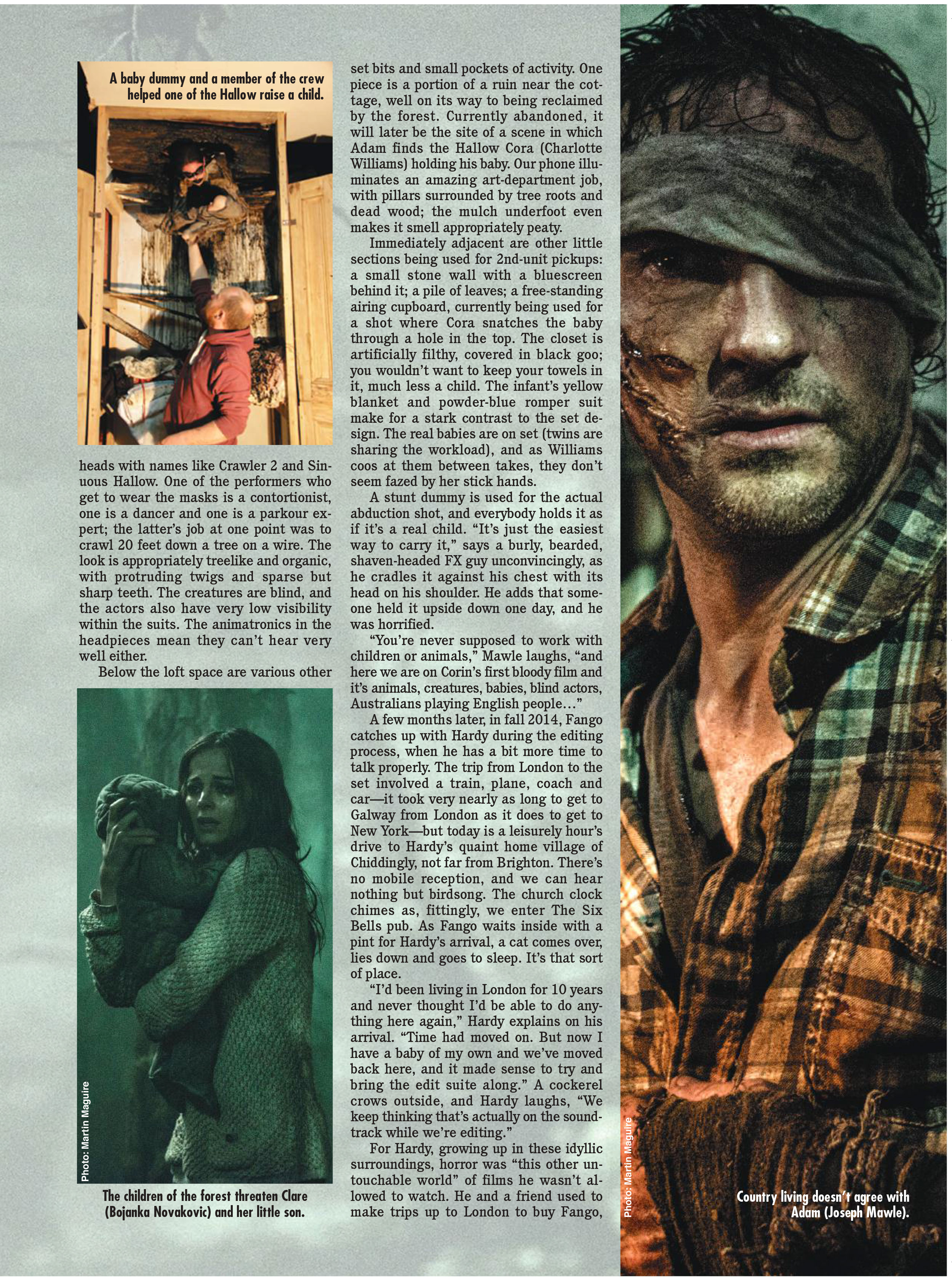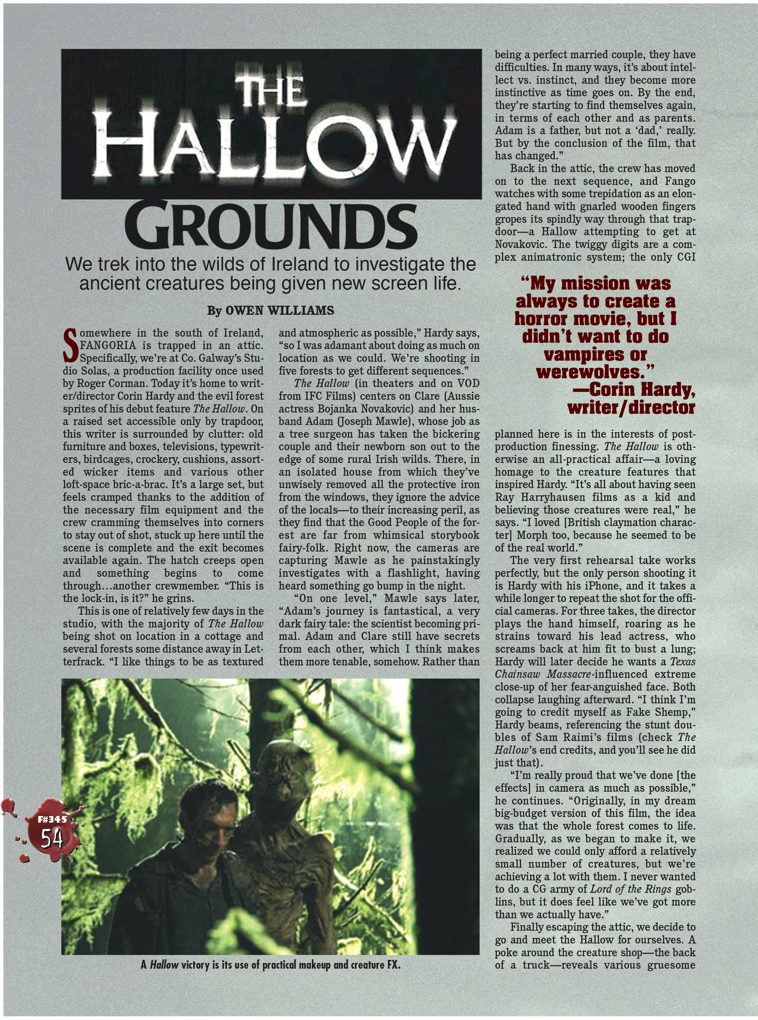 A set-visit feature and follow-up interview with Corin Hardy, writer/director of the Irish-set folk horror The Hallow. This was for the now infamous Fangoria issue #345, which turned out to be the end of Fango‘s original 26-year run. Only 15 test copies were actually printed, and it was otherwise only released digitally – and that barely. So here are the pages from my feature in officially the rarest and most collectable Fango of them all. Click on each one for higher, more legible, zoom-inable quality. And click the link earlier in this paragraph for a PDF of the whole magazine.